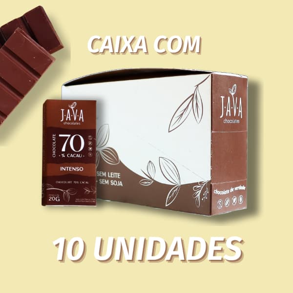 Caixa contendo 10 tabletes de 20g cada de chocolate 70% cacau